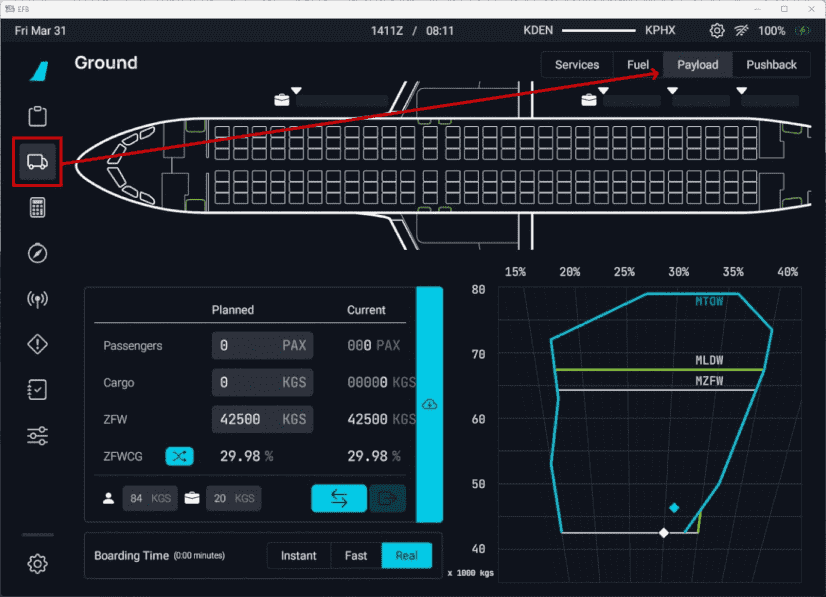 The payload section can be found in the Ground Services Page on the EFB and selecting the Payload tab.