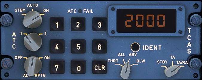 The aircraft has two ATC transponders (XPDR) which are controlled by a control panel (ATC/TCAS) on the center pedestal.