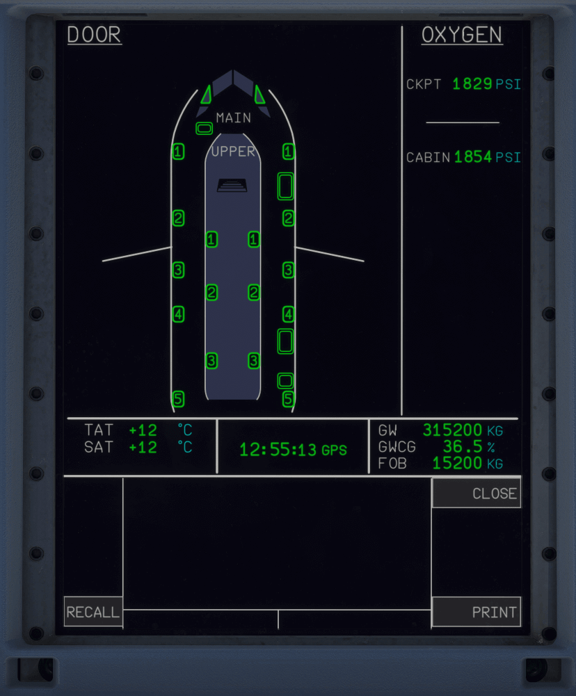 • The middle section displays permanently-displayed data such as: External temperature, time, aircraft weight, CG, and Fuel On Board (FOB).