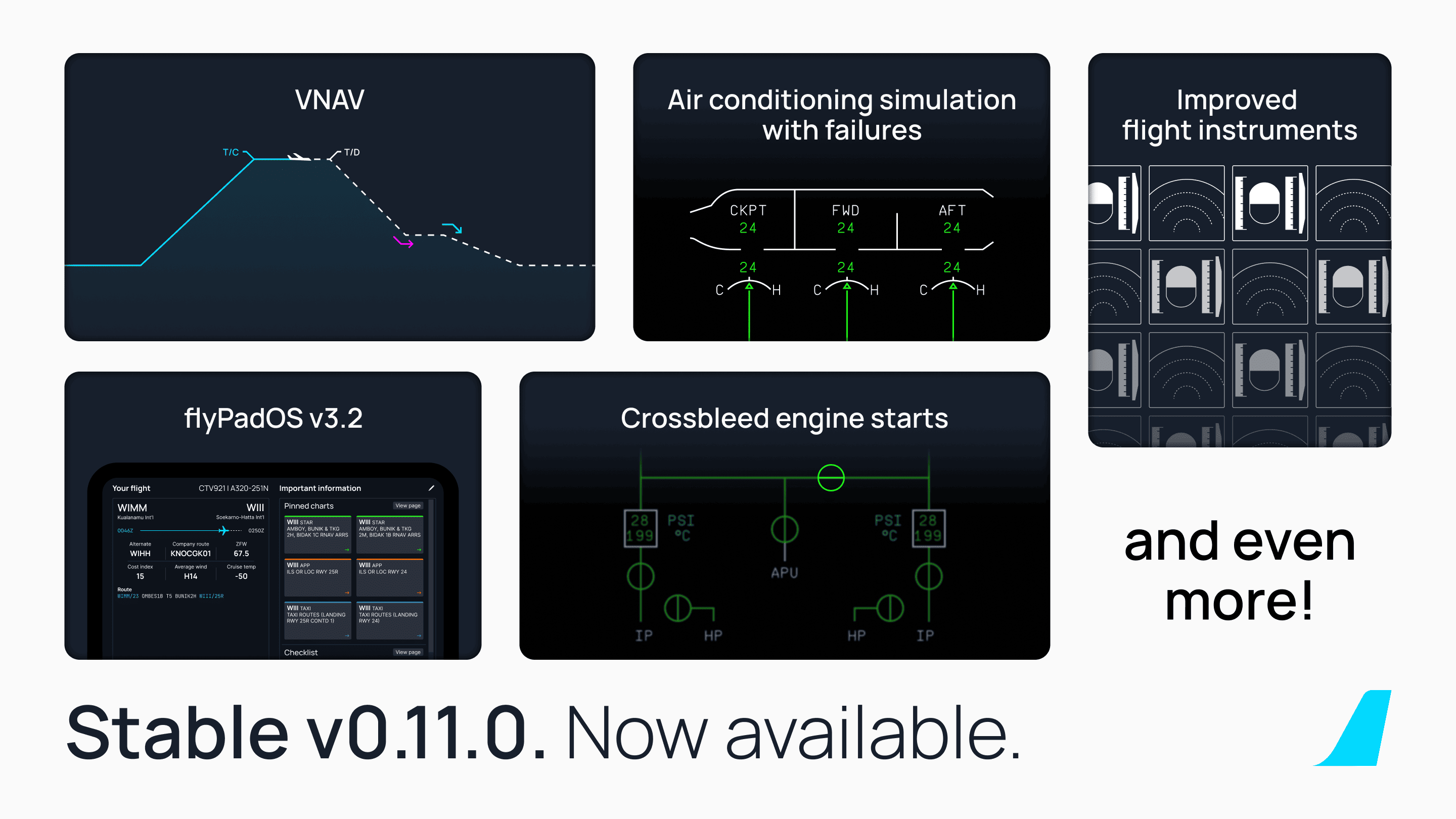 Immerse yourself with advanced navigational capabilities as we introduce vertical navigation to the Stable Version of the A32NX. We have refined various crucial flight instruments, bolstered the FMS with comprehensive updates, and introduced new realistic simulations of systems involving cross bleed engine starts and air conditioning.